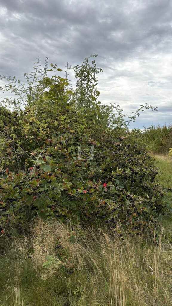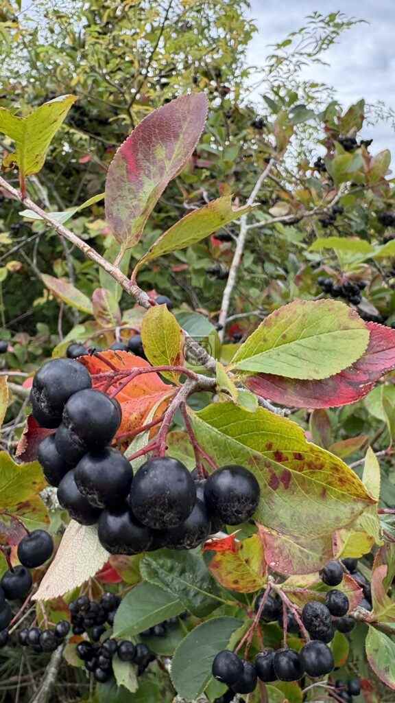 Plocka svarta aroniabär som mognar i slutet av sommaren och tidig höst. Likt rönnbär blir sötare efter första frosten eller så fryser man dem själv något dygn innan man använder dem.