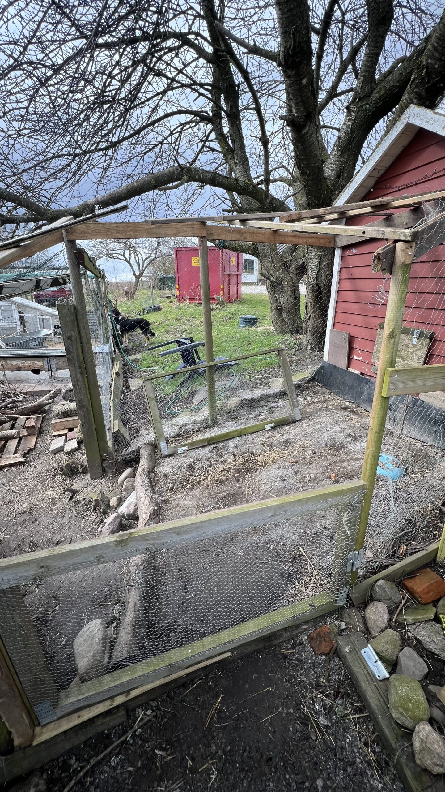 Nu när jag inte har höns längre och kommer inte att skaffa igen så gör jag om utegårdarna till kaninerna. Vill inte att kaninerna ska sitta inne och uggla utan att de ska kunna vara ute och leva så bra som möjligt. Där har de det bra med aktiviteter, gömslen, leta mat, sovrum osv. Killarnas hägn måste ha fler gömslen men det är på G och tjejerna ska få lite trädgårdsjord i en sandlåda som de kan gräva i…