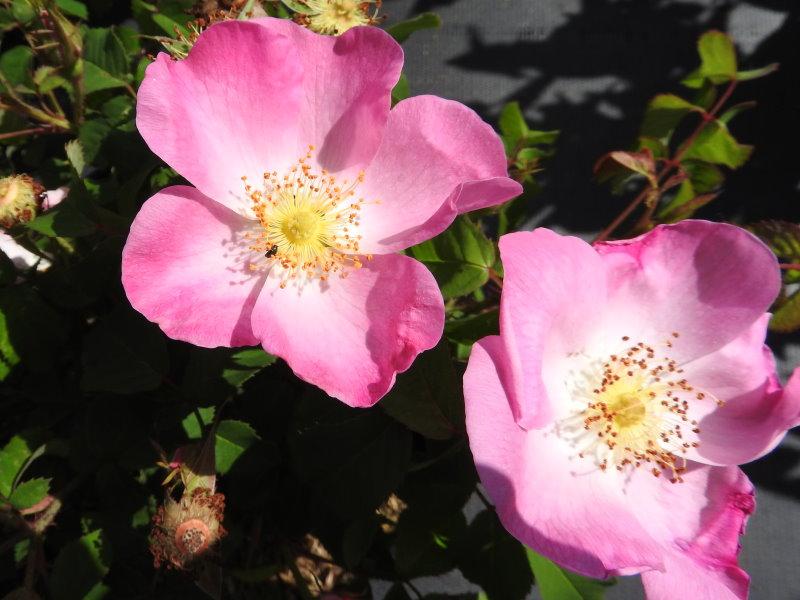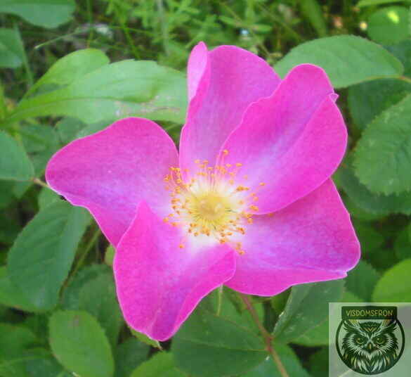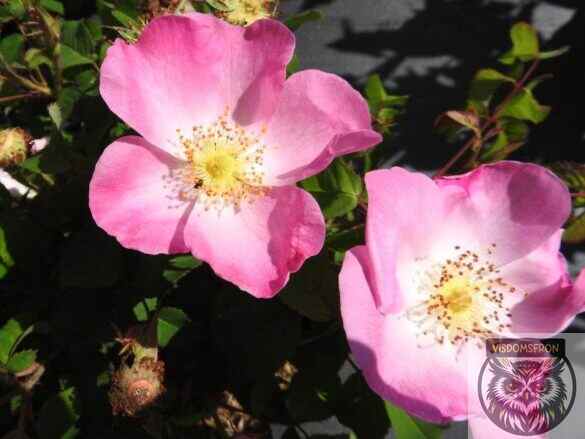 Bildar en låg, tät buske som bildar stora bestånd genom rotskott, 50–200 cm, men vanligen runt 80 cm. Stammarna är röna eller rödaktiga, har oliklånga, krokiga taggar och klibbiga borst. Bladen är grågröna, parbladiga med 3–7 delblad som är relativt hårda, äggrunda till smalt elliptiska, rundade i spetsen och dubbelt tandade. Blommorna sitter ensamma eller 2–4 tillsammans, 4–8 cm i diameter, de är doftande och djupt rosa till karmosinröda. Skaften har klibbiga borst. Foderbladen är flikiga, böjer sig bakåt och ramla av efter blomningen. Frukten är rund till äggrund, ca 1,3 cm, tätt beklädd med klibbiga borst.