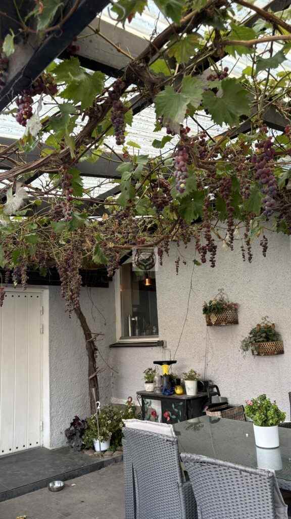I trädgården ser jag syrénbuskar, den äldre busken doftchersmin. tulpanträd, pil, tulpaner, roser, svart mullbär på stam, perukbuske, bornholmsfikon, stockrosor, vackra vindruvor, fjärilsbuske, blodbok m fl. I trädgårdslandet som hon har inne i en gammal hönsgård ser jag ett land där hon har haft god skörd på det mesta hon har odlat. Tror Lotta har lite gröna fingrar allt!