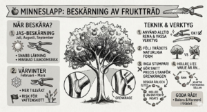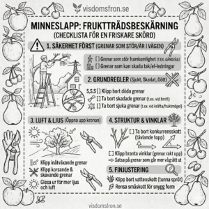Checklista för sundare fruktträdAtt beskära fruktträd är en av trädgårdens viktigaste uppgifter, men det kan kännas klurigt att komma ihåg allt när man väl står där med sekatören och sågen. För att du ska känna dig trygg och göra rätt snitt har vi skapat denna praktiska minneslapp.