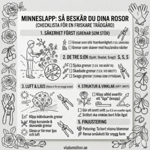 Rosbeskärning – GrundernaAtt beskära rosor behöver inte vara svårt, men det är lätt att glömma bort detaljerna när man väl står där med sekatören i handen. För att hjälpa dig att ge dina rosor de bästa förutsättningarna för en praktfull blomning har vi skapat en praktisk minneslapp.