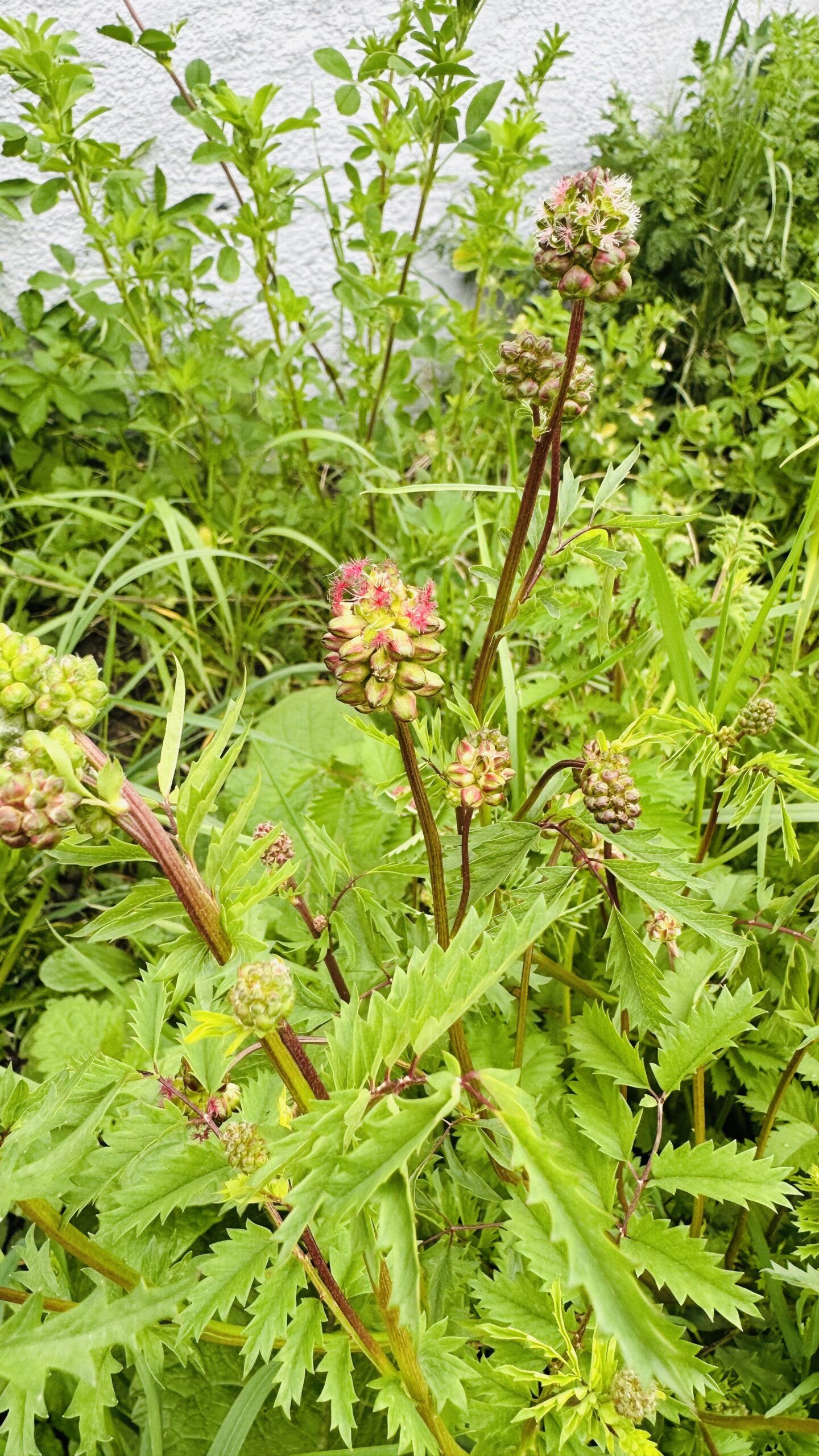 Välförgrenad, buskig och yvig perenn som bildar marktäckande tuvor av ett friskt grönt bladverk. Parbladig med tandade kanter. Sorten blommar med små, rundade mörkt röda blomax. Blommorna sitter i toppen av tunna, skira stänglar ovan bladverket. Blommorna uppskattas av våra pollinatörer. Fin i rabatter och passar bra som vävarväxt tillsammans med andra perenner. Blommorna står sig länge som snittblomma och går även bra att torka.