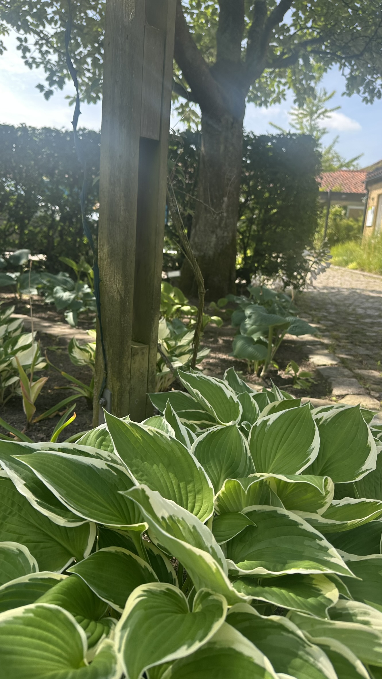 Gammal perenn som funnits länge och vi har de för bladen inte för blommorna. Örtartad perenn med jordstam, ca 50 cm hög. Olikt många andra enhjärtbladiga växter har Hosta ett tydligt bladskaft och en väl avsatt bladskiva med bågböjda nerver. Blommorna (jun-aug) är vita eller lila, sextaliga, nickande, klock- eller rörlika, doftlösa, på en hög blomställning. Frukten är en torr kapsel. Härstammar från Japan. Används i rabatter, vid vattenanläggningar som är väldränerade. Både blad och blommor är fina som snittblomma. Förökas genom delning. Ser ut som en sparris när de kommer upp ur jorden. Ställena de gror på kan se tomma ut då de vissnar ner helt men kommer upp så fort värmen kommer.