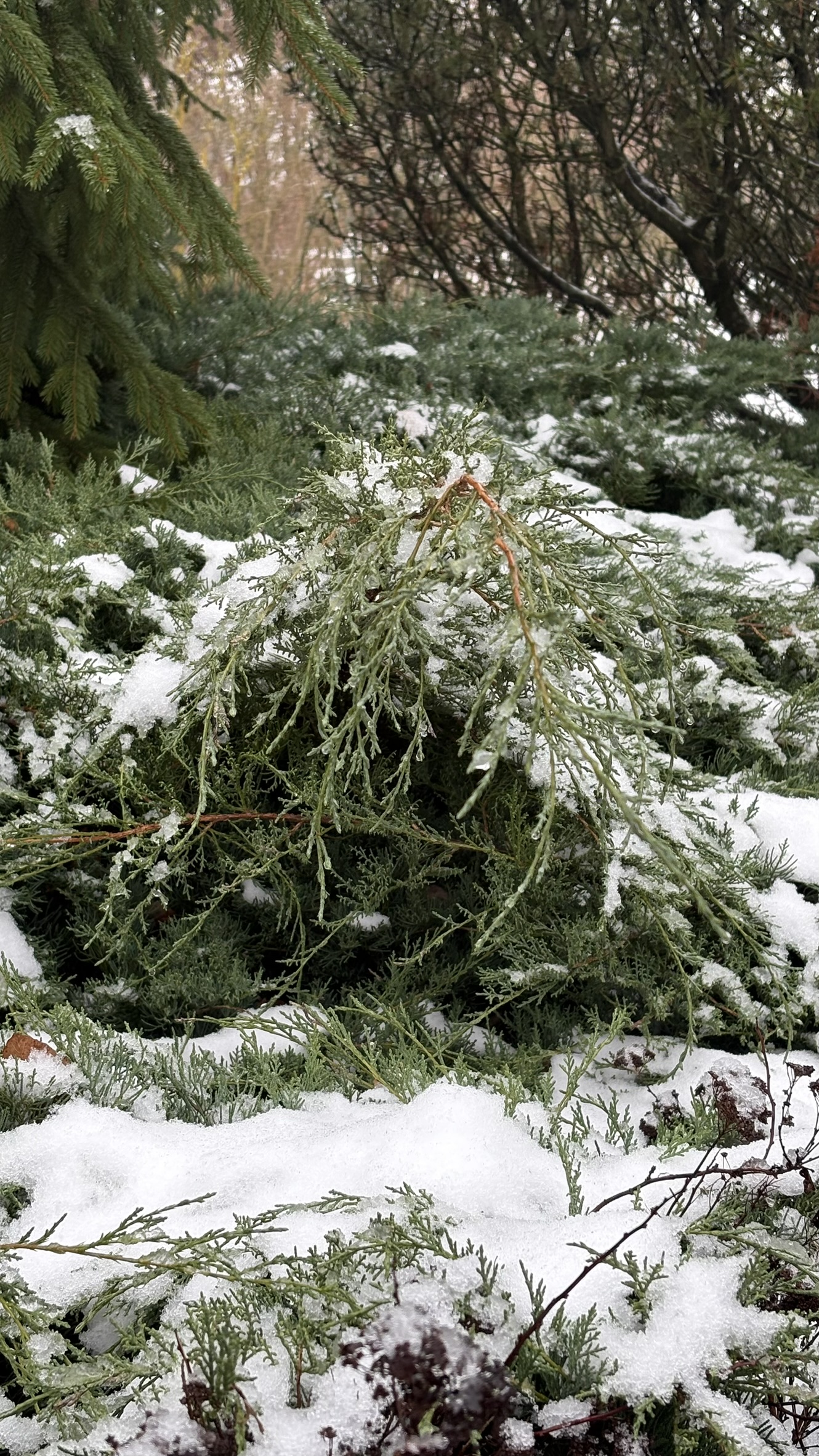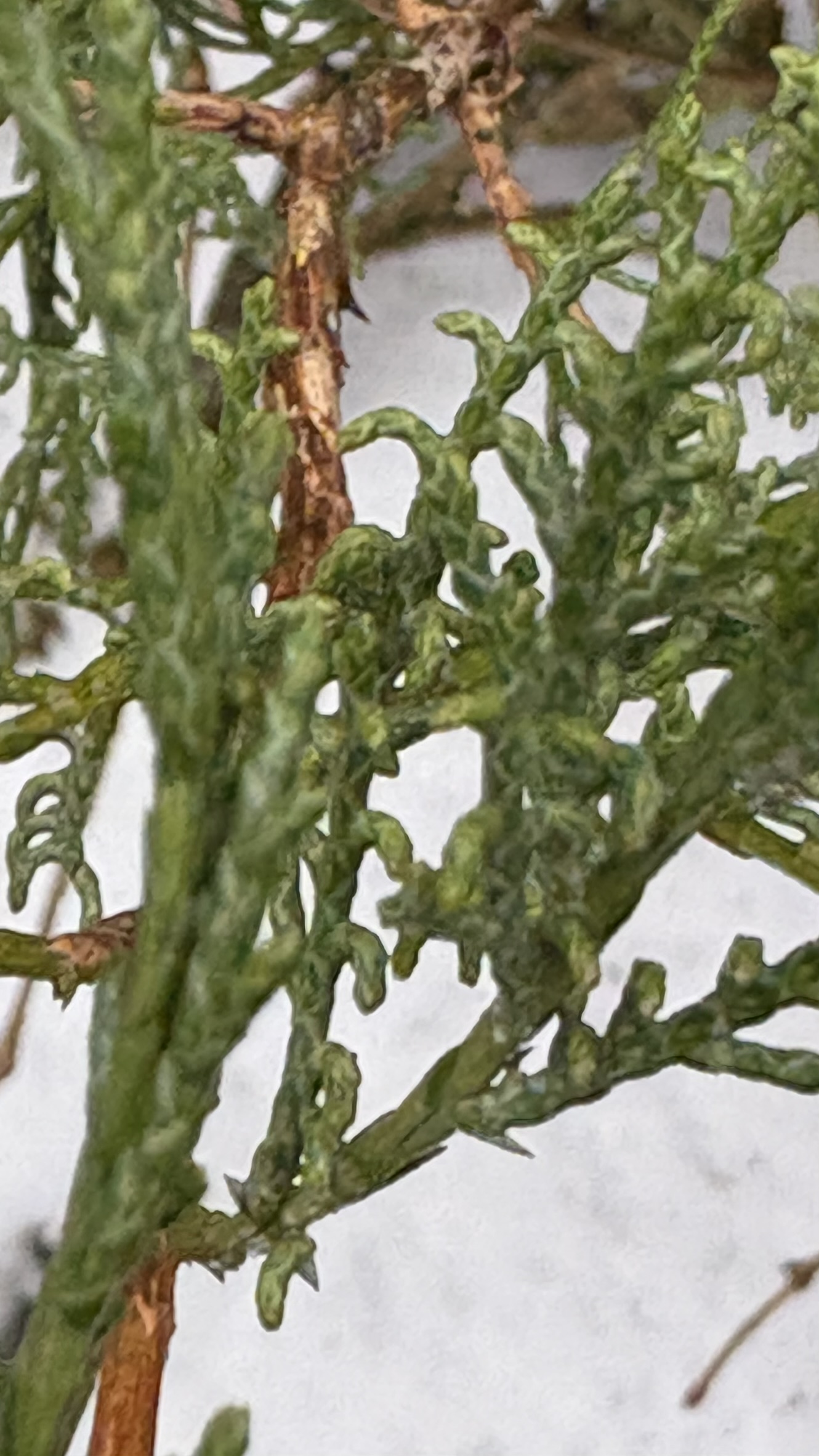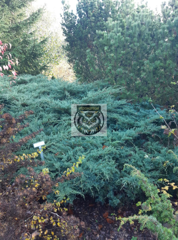 Brett och yvigt växtsätt, 5-7 meter bred men bara ca 1 m hög. Grenarna ligger ofta i tydliga täta horisontella lager. Barren är korta, fjällika och blågråa till grågröna. Barken är gråbrun och flagnar av i långsmala remsor på äldre exemplar. Honplanta som får runda, grå-svarta bärlika kottar. Kommer från SÖ Kanada, C, Ö och S USA.