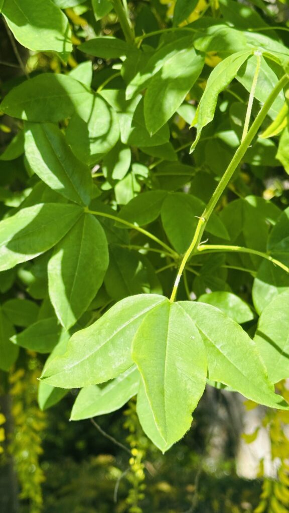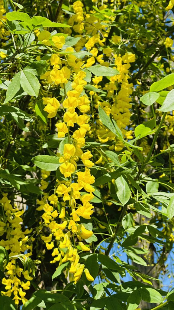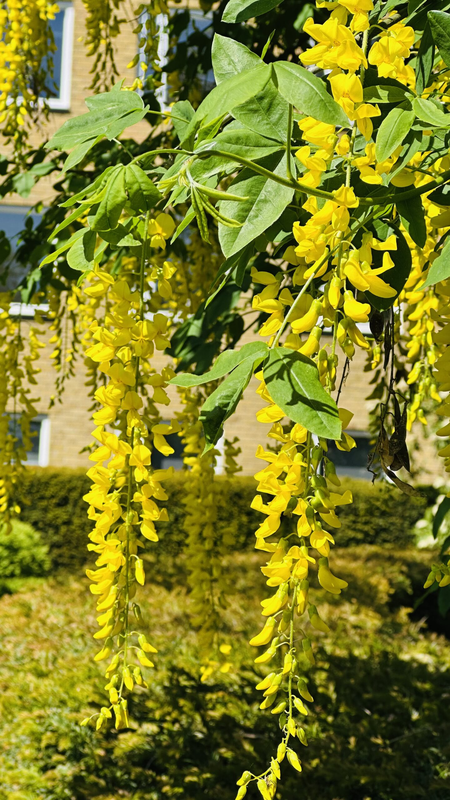 Lövfällande buske eller mindre träd (3-3,5m) med grön bark. Blad trefingrade med långa bladskaft. Gula fjärilsblommor i långa klasar. Börjar blomma något senare i maj än föräldrarten L. alpinum. Doft svag. Får sällan frukt, och de baljor som finns har ofta färre frön. Fortfarande lika giftig som ursprungsarterna. Bladen är betydligt större än den vanliga sorten.