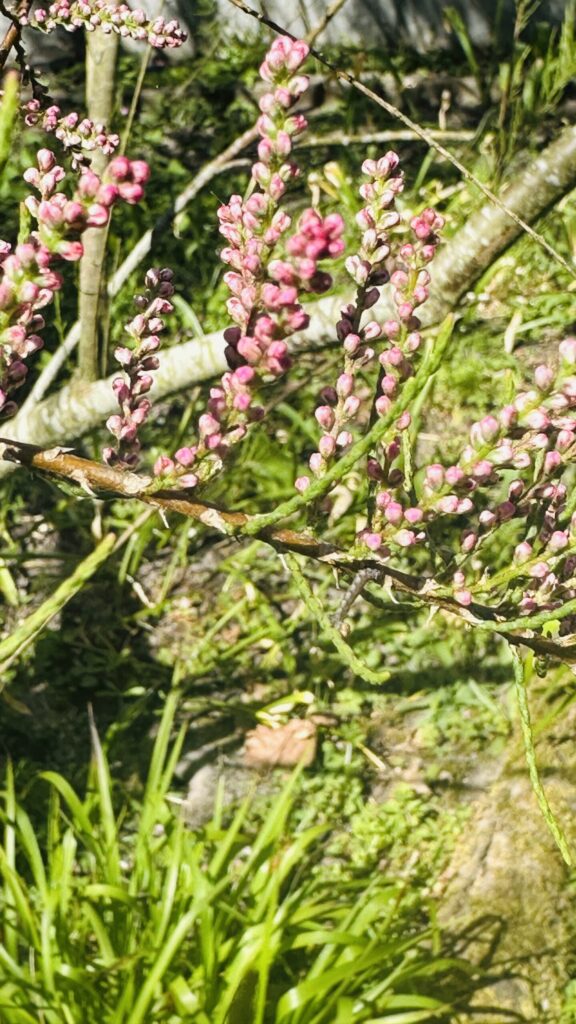 Trädliknande buske (3-5 m) med 2 mm korta fjäll-barrlika blad, kan misstas för barrträd när man inte ser blommorna. Blommor i ax, rosa, små (5 mm), fyra kronblad och fyra ståndare. Frukten är en torr kapsel.