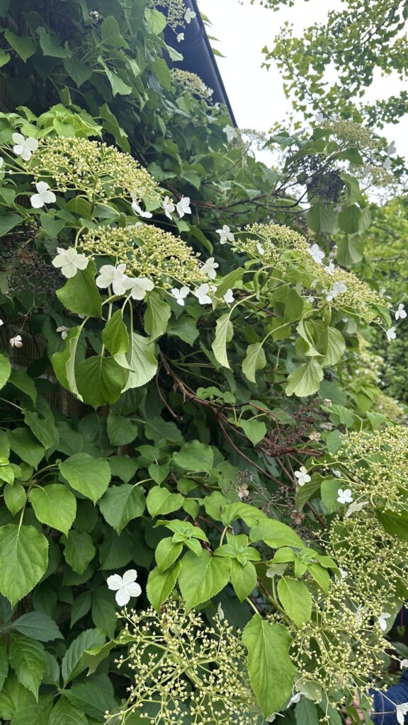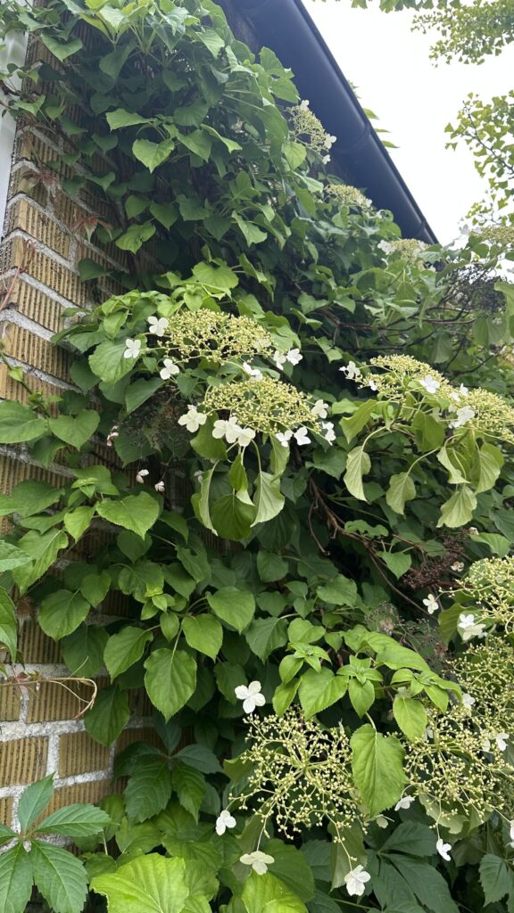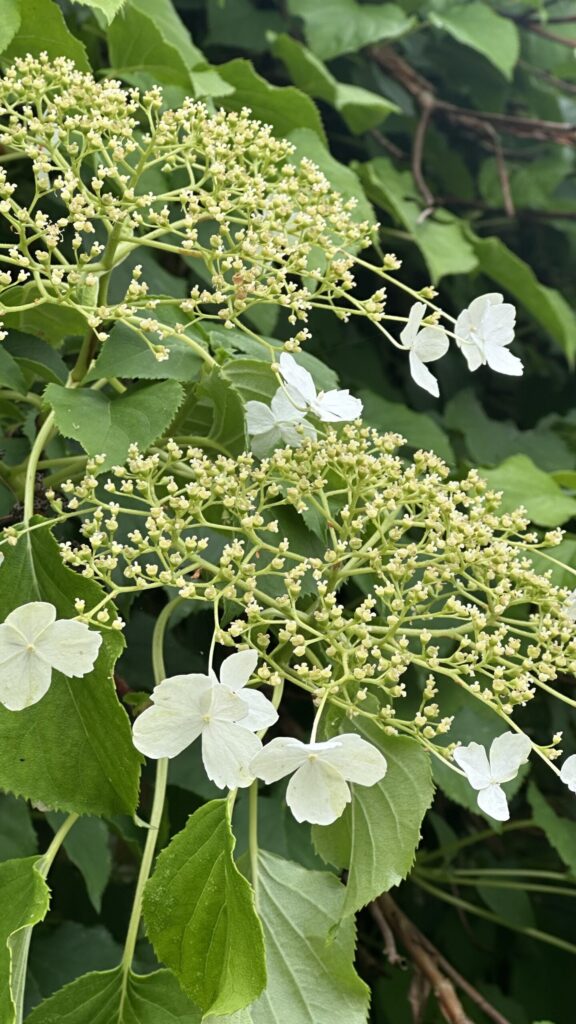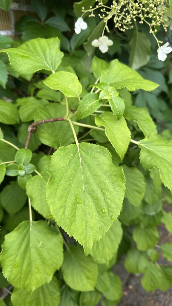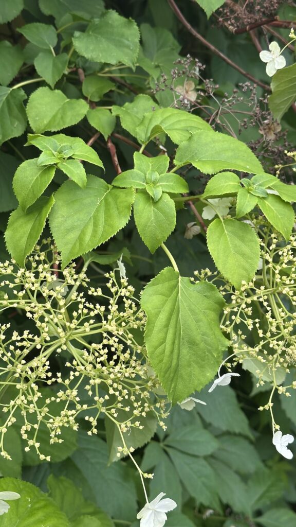 Lövfällande buske med luftrötter, styva grenar och tunn, avflagnande bark. Blir 4-7 meter hög. Korsvis motsatta hela blad med sågad kant. Stora (30 cm) flata flockar med vita fyrtaliga skenblommor i kanten, mindre, vita, fertila, sambladiga blommor i centrum. Blommar i juli-augusti. Frukt en kapsel. Härstammar från Korea, Sachalin, S Kurilerna, Japan och Taiwan.
