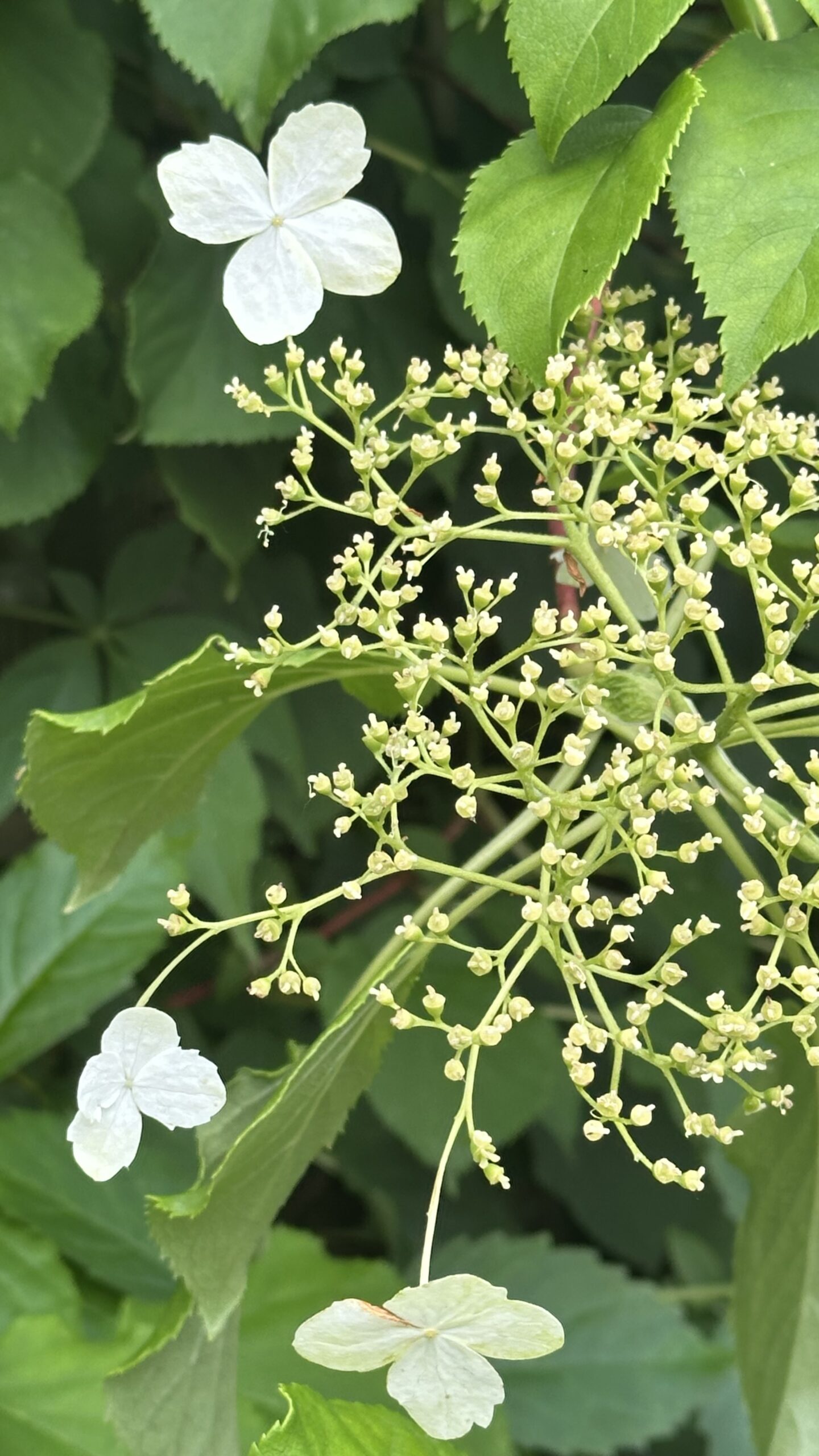 Lövfällande buske med luftrötter, styva grenar och tunn, avflagnande bark. Blir 4-7 meter hög. Korsvis motsatta hela blad med sågad kant. Stora (30 cm) flata flockar med vita fyrtaliga skenblommor i kanten, mindre, vita, fertila, sambladiga blommor i centrum. Blommar i juli-augusti. Frukt en kapsel. Härstammar från Korea, Sachalin, S Kurilerna, Japan och Taiwan.