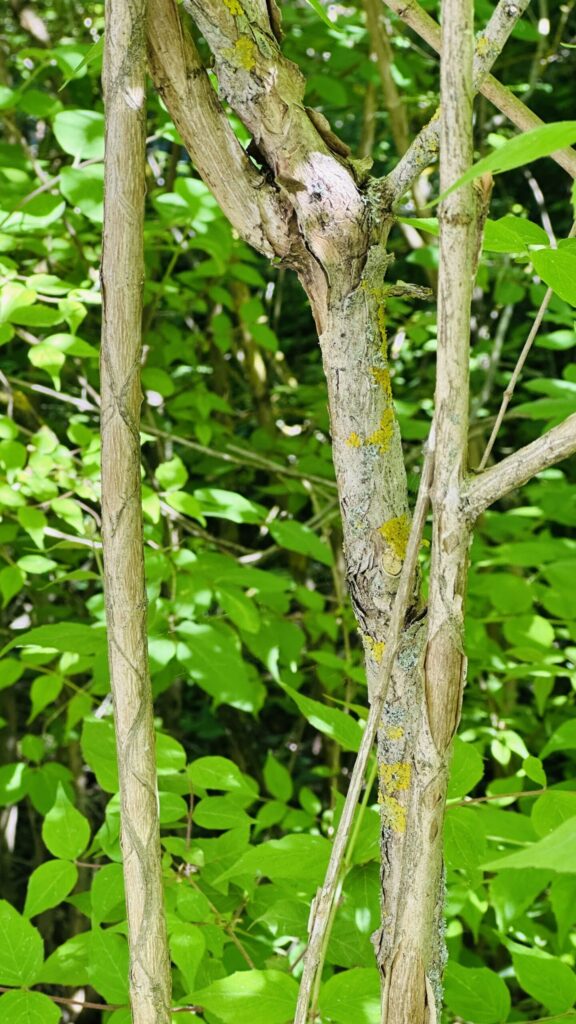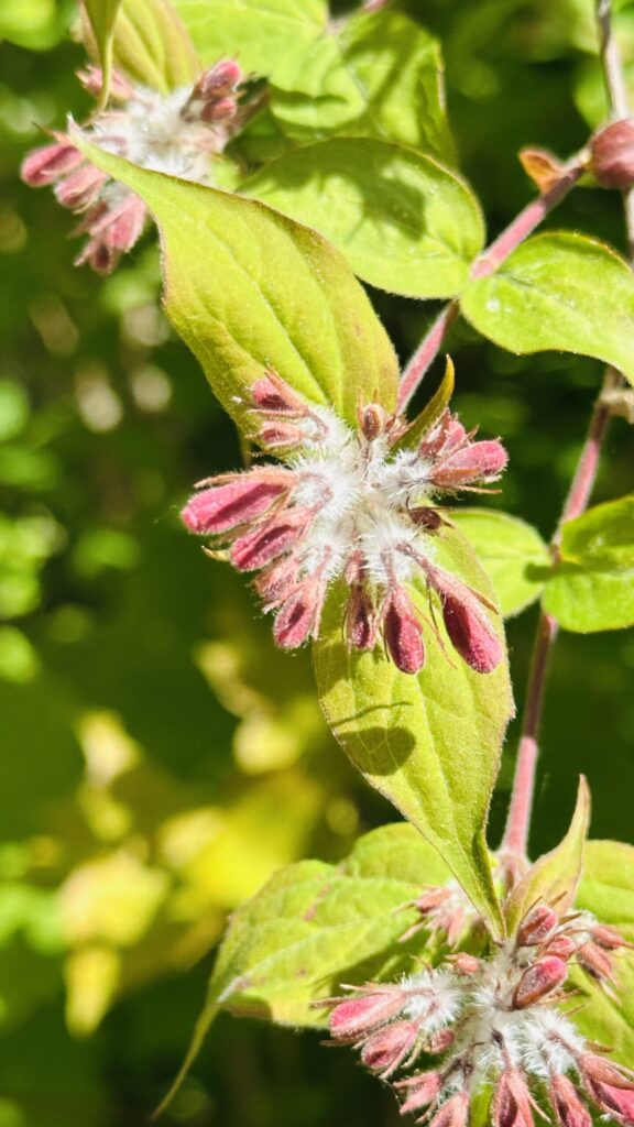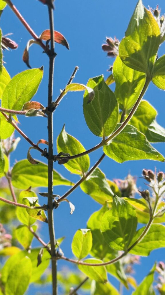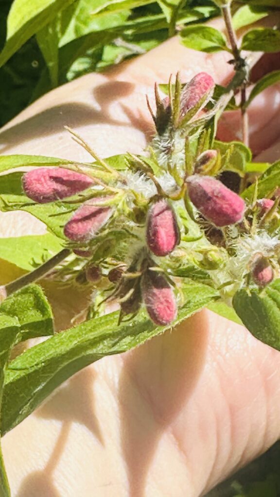 Lövfällande buske (3m) med bark som avflagnar i långa remsor. Luden kvist vid nya grenar. Bladen är motsatta, enkla, elliptiska, helbräddade. Sambladiga, klocklika, vitrosa blommor (2-3 cm), Underläppen treloberad, hårig, med orange mönster. Överläppen är tvåloberad. Nötter krönta av fem gamla foderblad, inbäddade i borstlika högblad. De små borsthåriga fruktställningarna är karaktäristiska för vinteridentifiering.