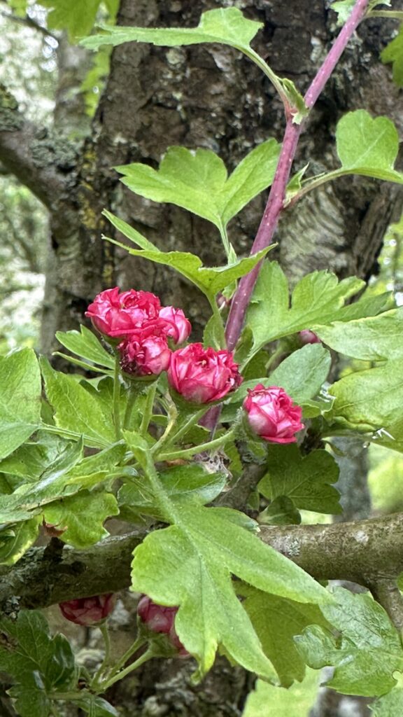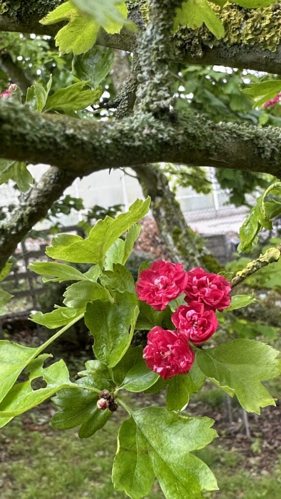Lövfällande buske eller litet elegant träd med tornar som blir ungefär 6-8 meter högt. Växer brett och kan med tiden bli upp till 6 meter bred. Blommorna är små och djuprosa, delvis fyllda likt rosor. Blommar i maj-juni Bladen är flikiga med grovsågade kanter. Denna sort bildar nästan inga röda stenfrukter. Hatar att bli beskurna då den blir en riktig risig och ser gräsliga ut. Hinder för boskap då man klyver den i mitten och böjer ner grenarna så den bildar en mur.