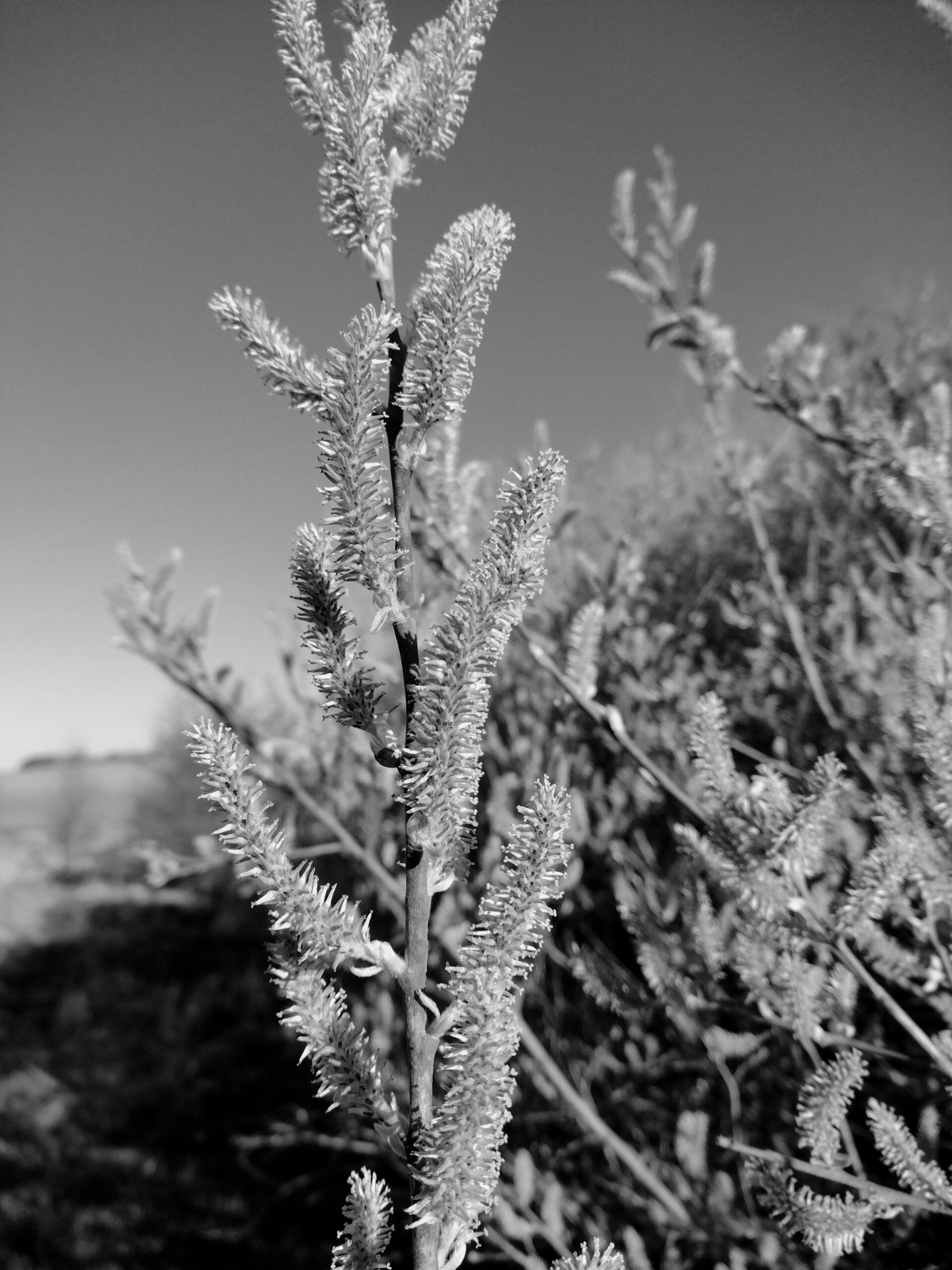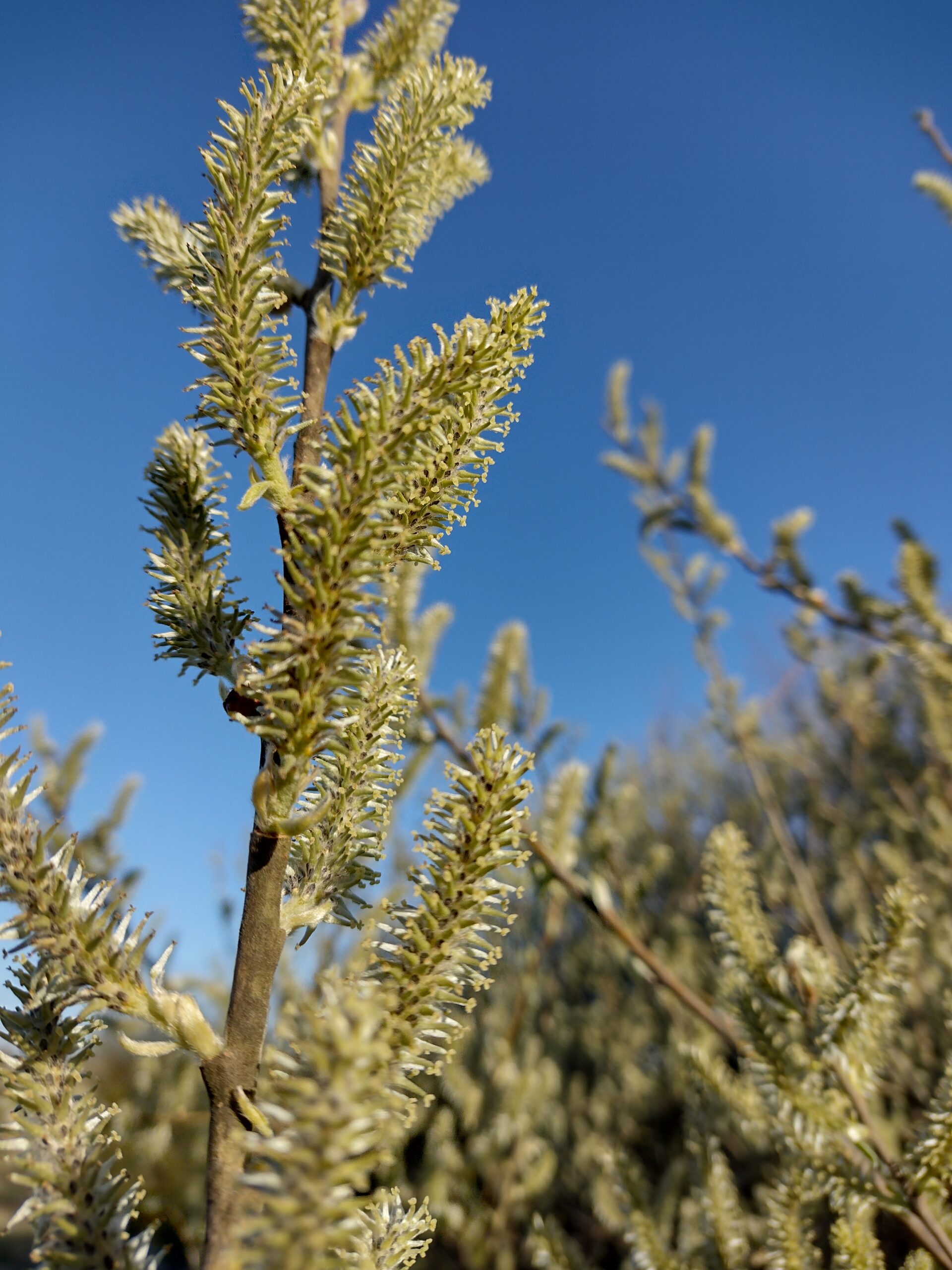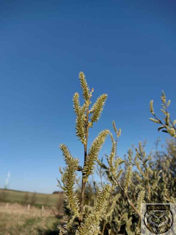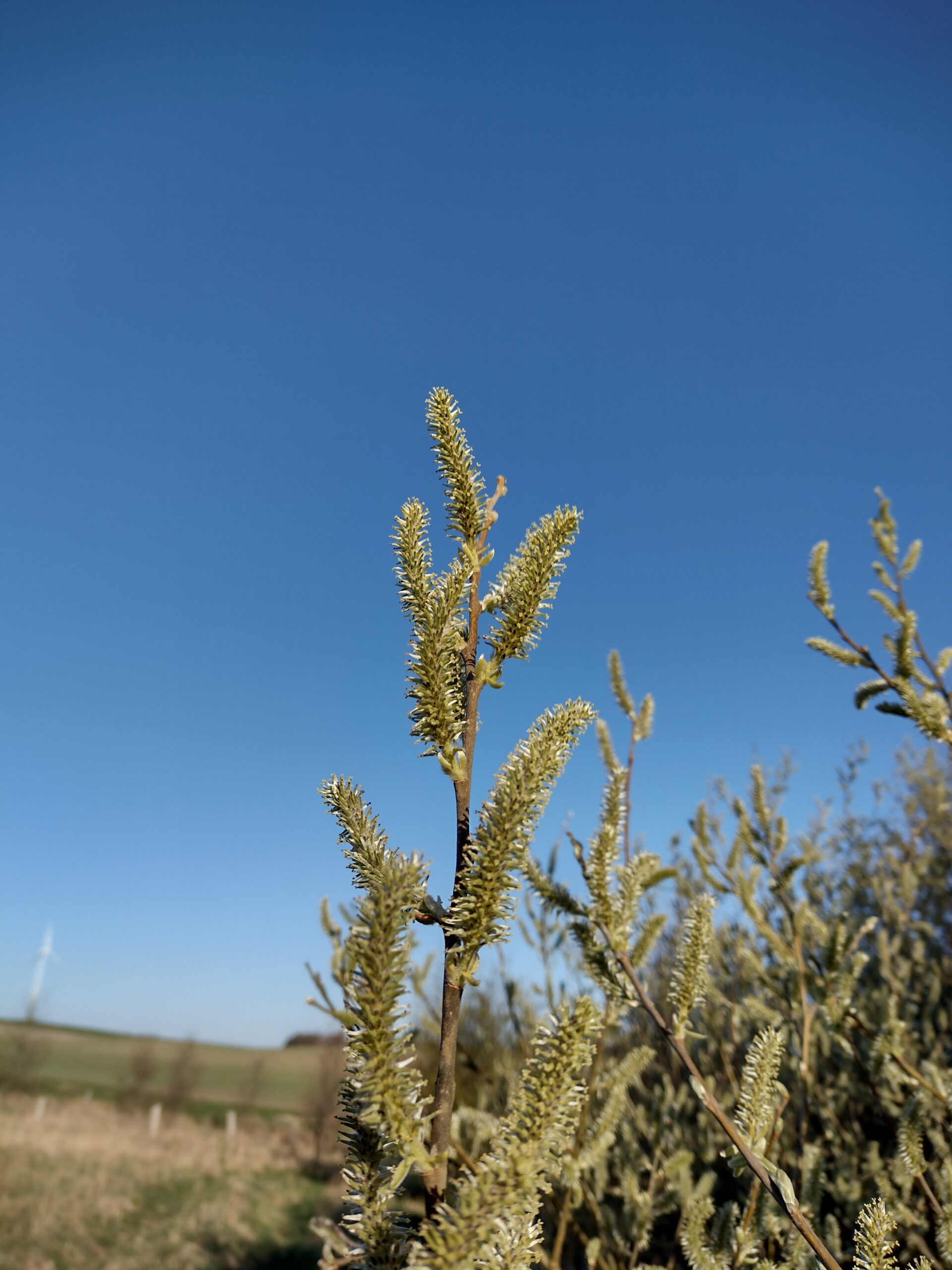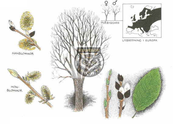 Lövfällande busk- eller trädformad art som kan bli upp till 10 meter hög. Gråaktig, skrovlig bark. Bladen är stora, ovala och bredast på mitten, kanten är naggad. Bladens ovansida är kal eller hårig, vanligen mörkgrön, och undersidan är fint sammetsluden. Blommar med gula, fluffiga blommor på bar kvist i april- maj. Härstammar från Europa, V Sibirien och Kaukasus.