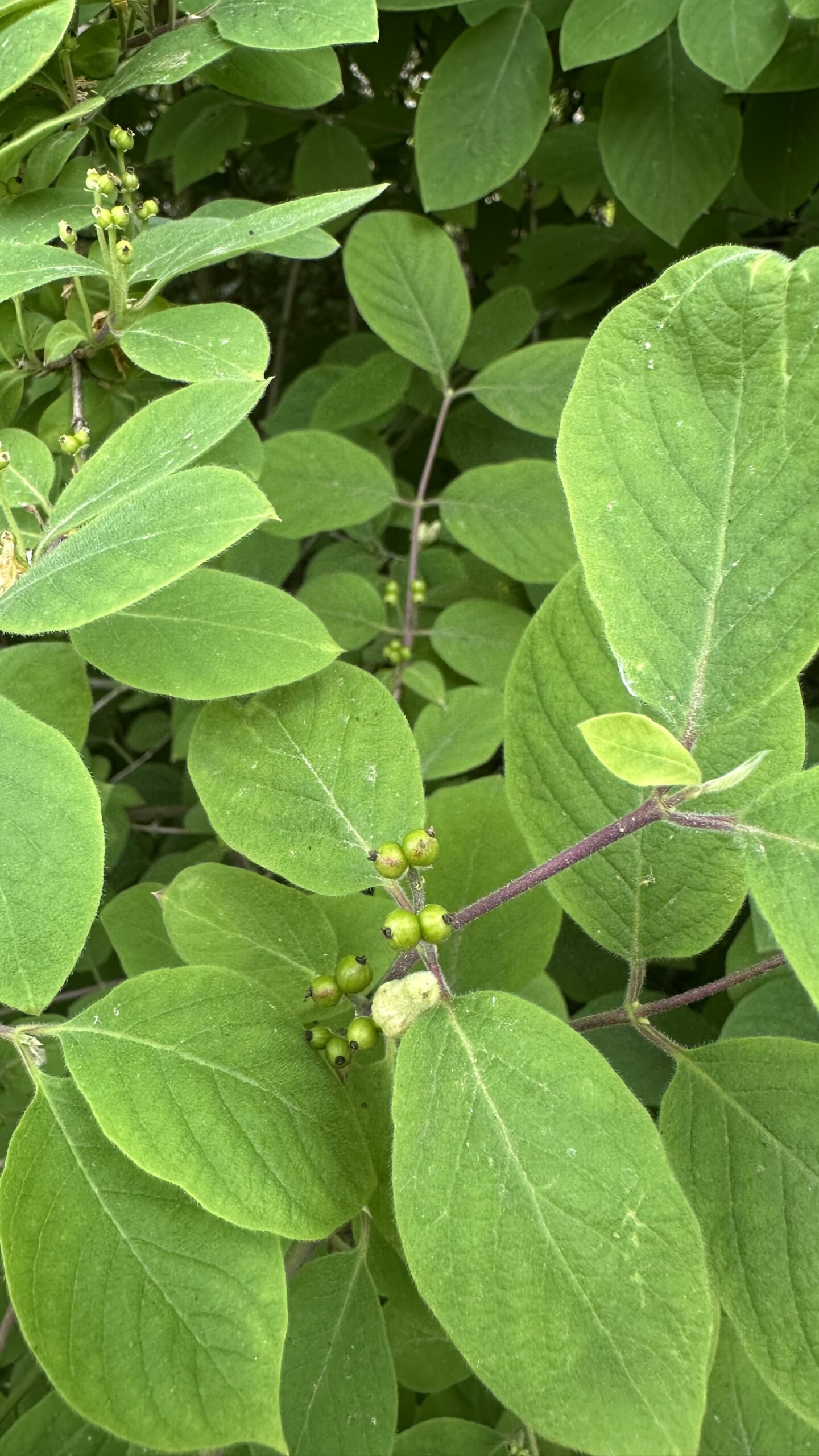 Lövfällande buske som blir 2 meter hög. Grå stam, spetsiga, utåtriktade och parvis motsatta knoppar. Blad enkla, grågröna, helbräddade, finludna. Blommor gräddvita, sambladiga med en fyrflikig överläpp och en enflikig underläpp. Bär parvis hopväxta vid basen, röda, giftiga.