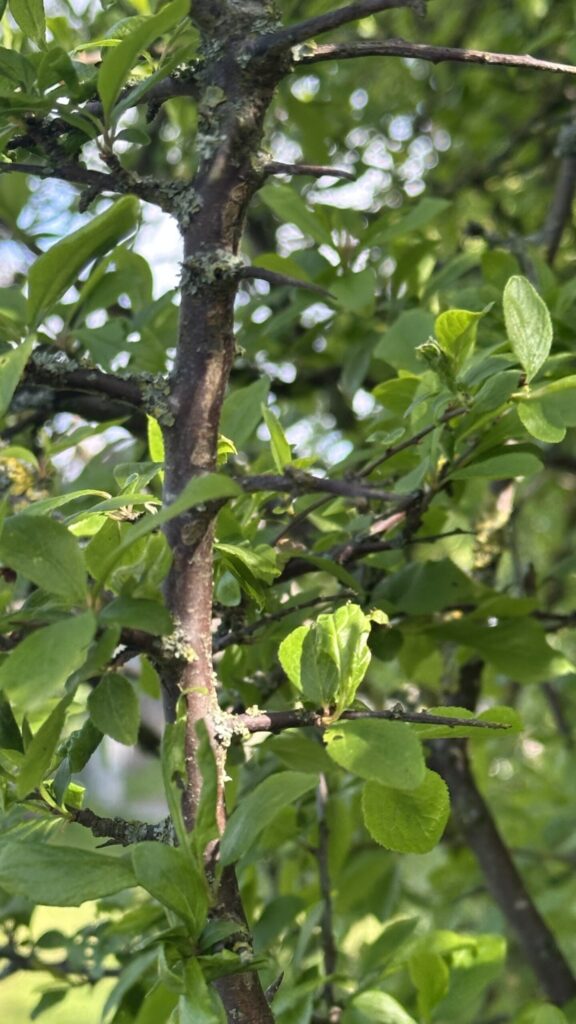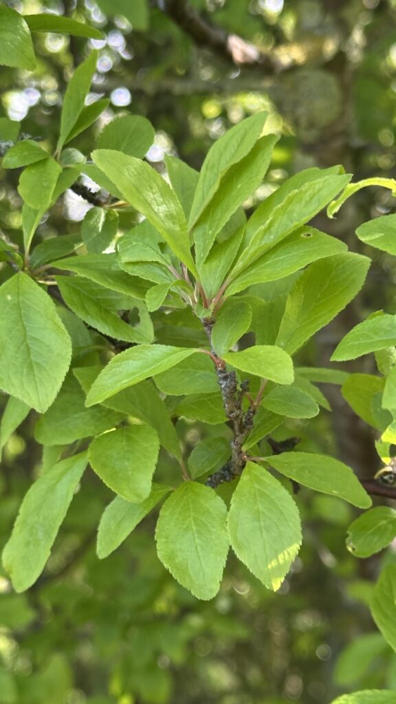 Inhemsk, sprider sig med rotskott, kan få blommor på sin torn, bären populär av fåglarna. Blir ca 2-3 meter hög. Blad små (2-5 cm), omvänt äggrunda med fint sågade kanter, saknar oftast extra florera nektarier. Vita blommor på bar kvist i maj, kronblad fem, små (5-8 mm), doftlösa, många ståndare. Under blomningen ’skummar åkrarna’. Stenfrukt blå, mycket lite fruktkött, adstringerande.