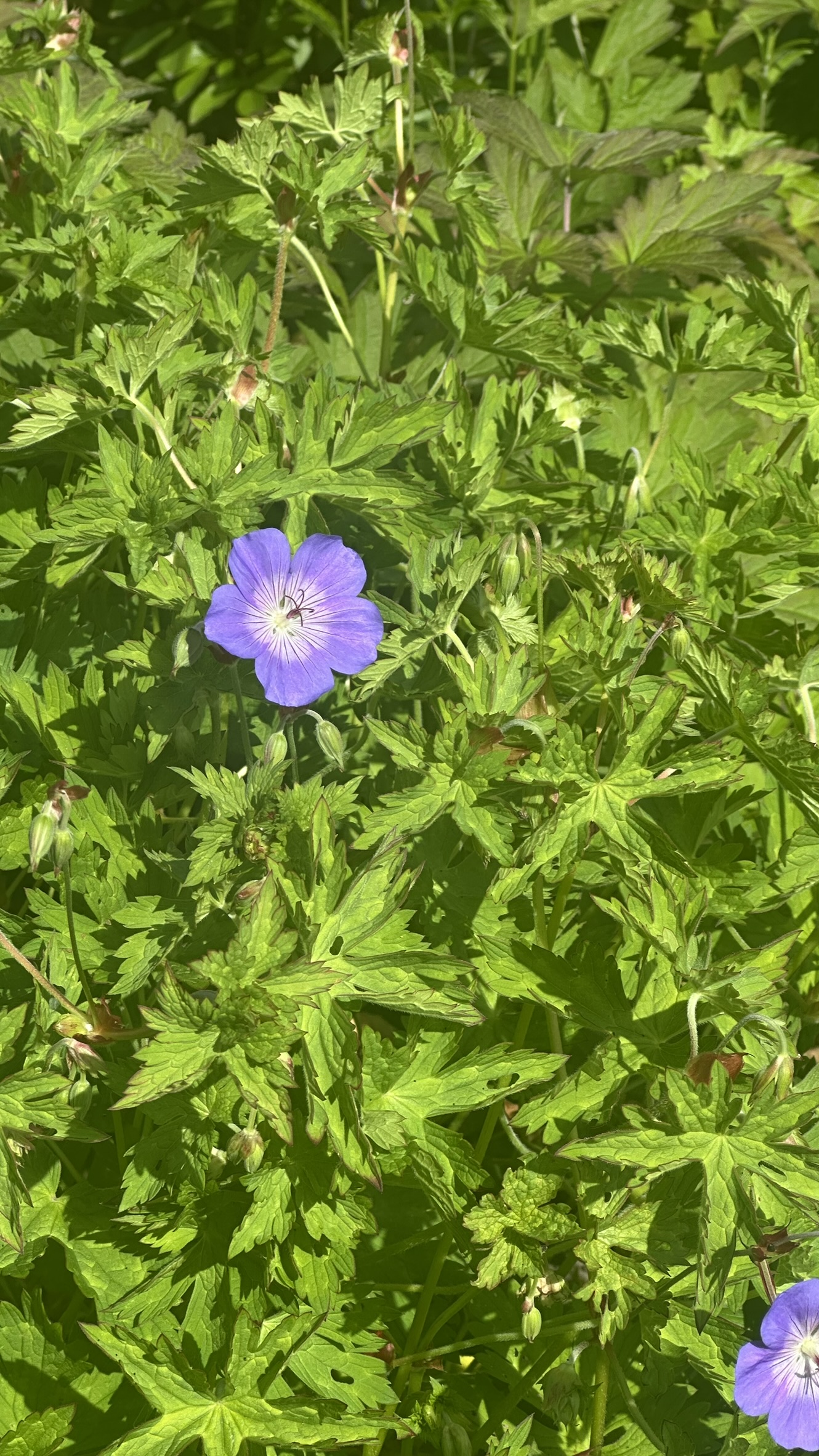 Väldigt vanlig perenn som blir 30-40 cm hög, stor buskig. Flikiga, runda blad med ljusare partier. Blålila blommor i maj-september med vitt öga, femtaliga. 1 stift, fem märken, tio ståndare. Härstammar från Geranium himalayense x G. wallichianum. Används i rabatt, marktäckare eller krukor. Plantera 40 cm emellan, måste tänka på att när väl plantan är etabelerad tar de plats. Vid lättare jord behöver de mer vatten.