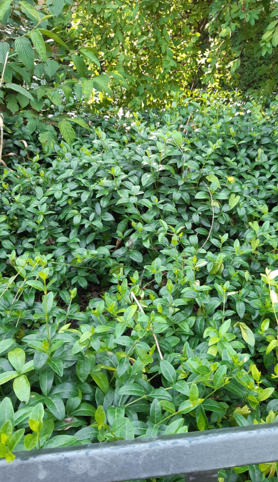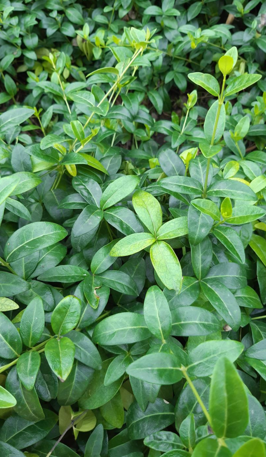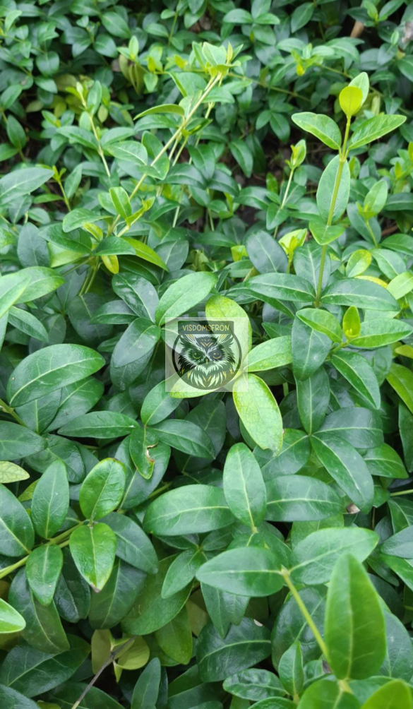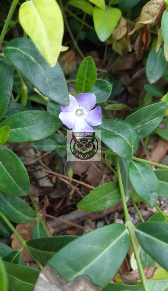 En städsegrön, krypande och rotslående halvbuske. Blir 10 cm hög som marktäckare, men kan växa upp mot väggar och ställning till en höjd av 40 cm, men klättrar inte. Får motsatta, mörkgröna, blanka och läderaktiga blad. Blommar i april-juni med ljust lila-blå-vita med en femflikig krona och gemensam pip. Kommer från Europa.
